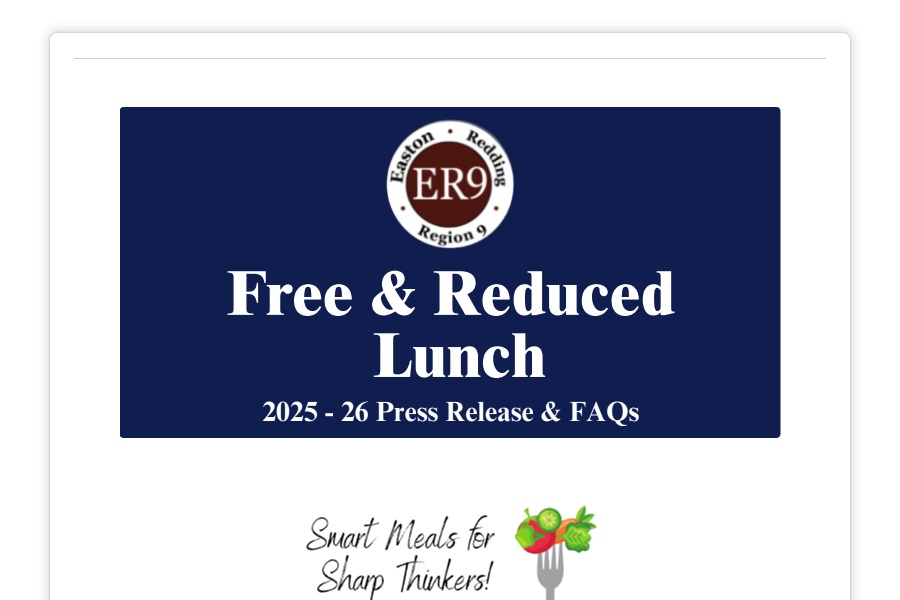 Press Release Please see below for the ER9 Press Release regarding Free & Reduced Lunch for the 2025-26 School Year. ER9 Press Release 2025-26 . . .